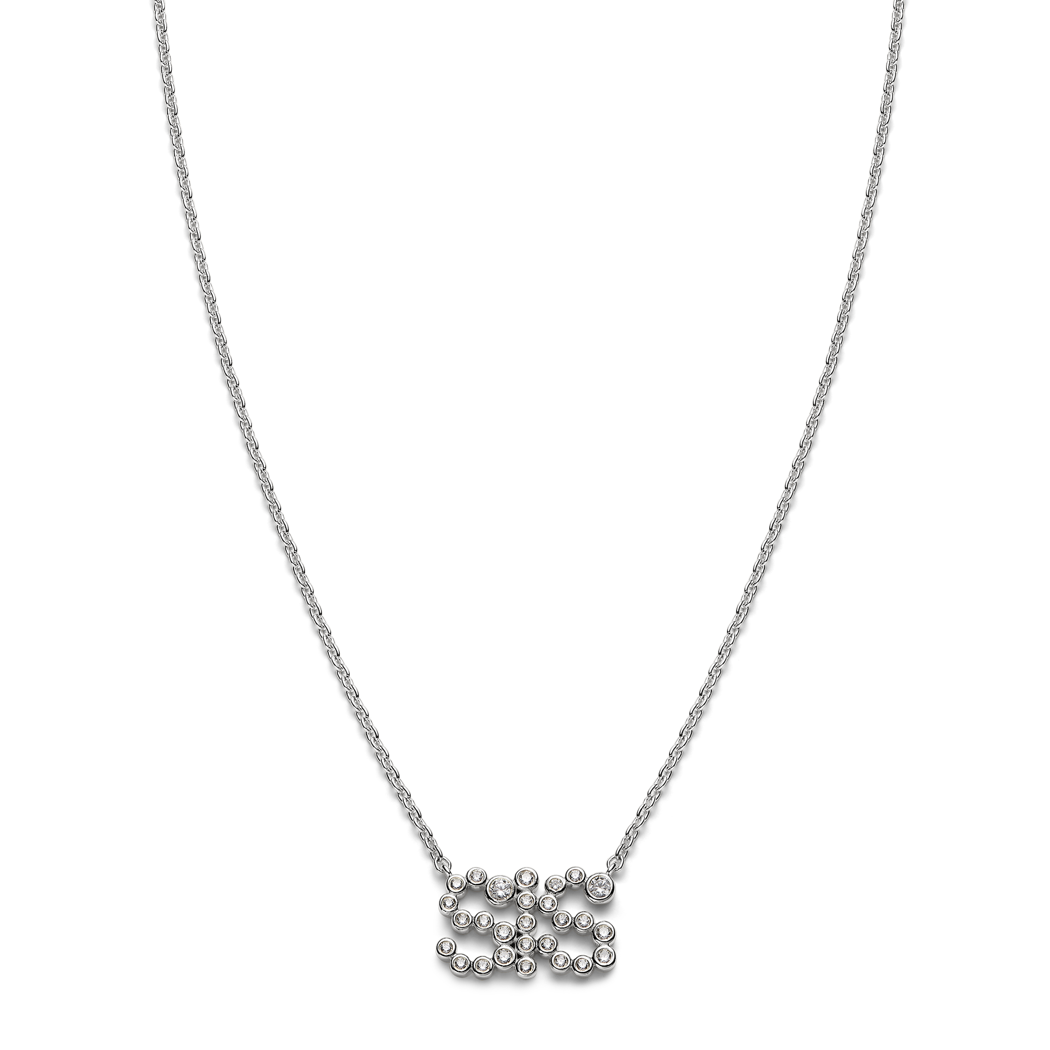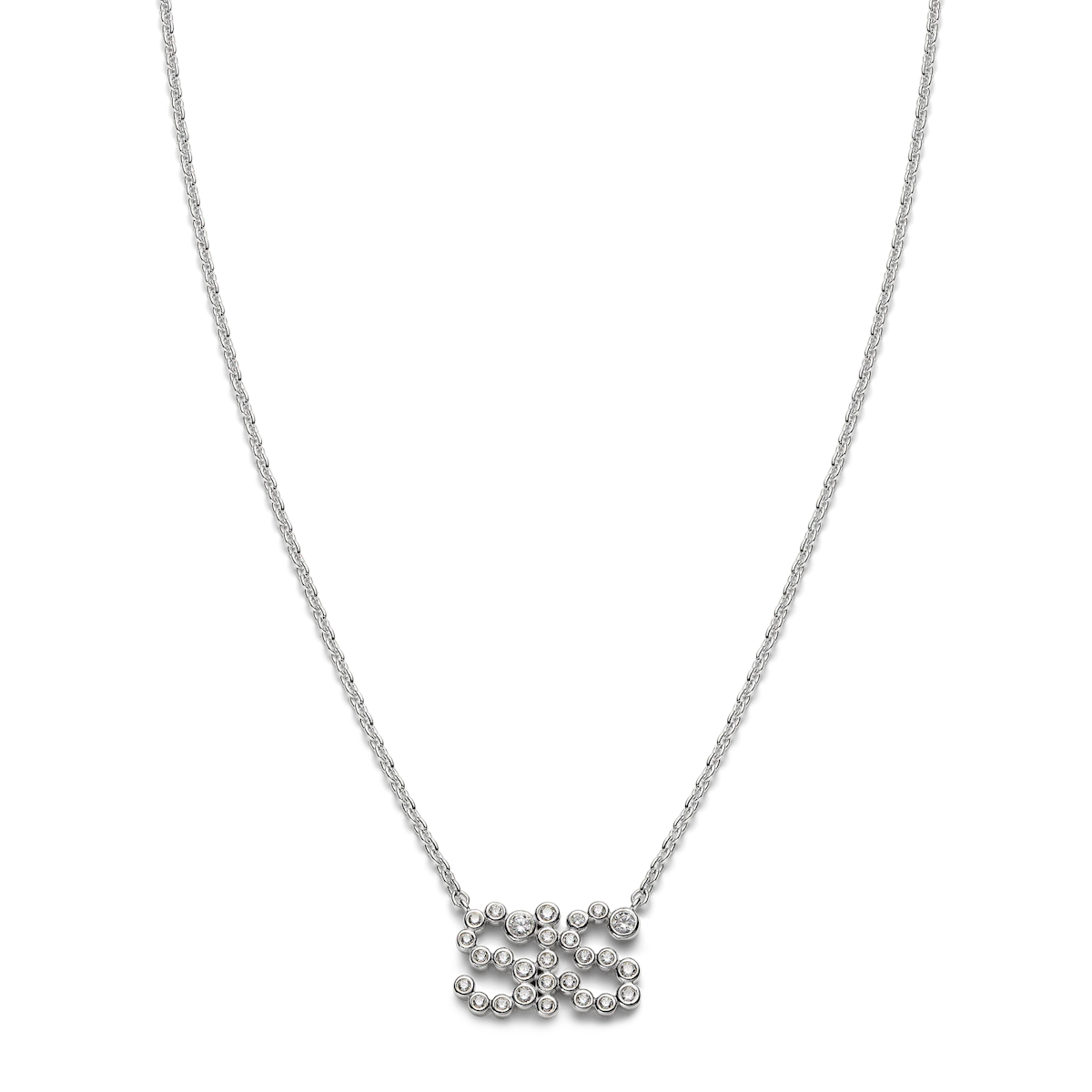 The letters are formed from 27 bezel-set brilliant-cut cubic zirconia stones in graduating sizes, creating a subtle rhythm of light.