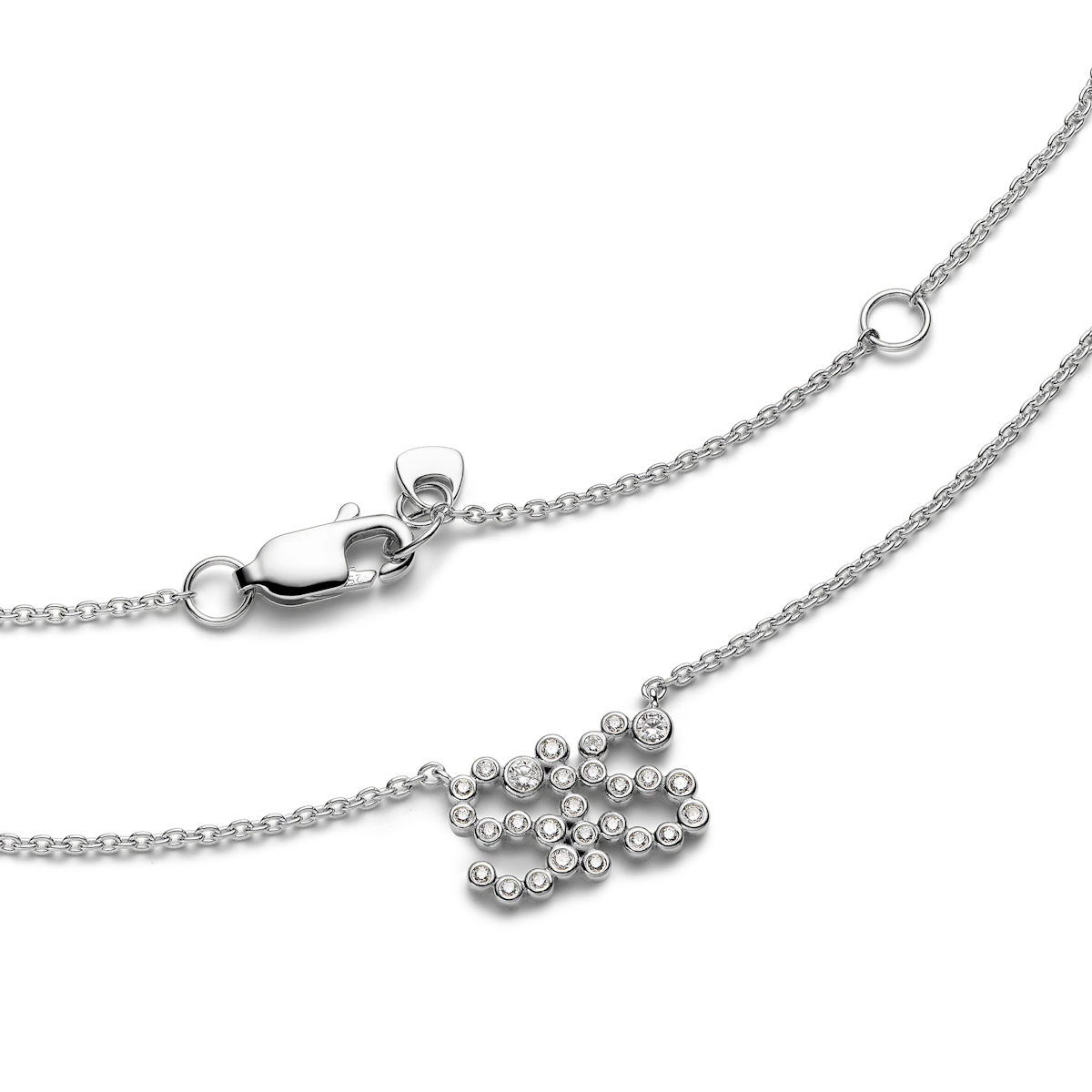 A delicate sterling silver SIS necklace set with cubic zirconia stones.