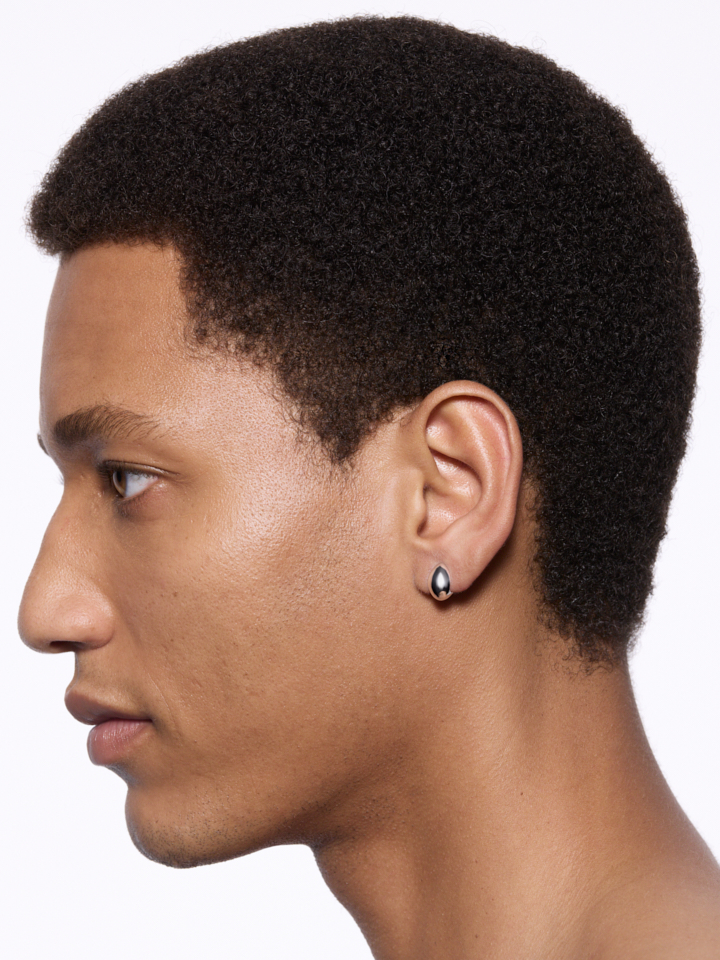 Oval huggie med kuppelform der ligger tæt og komfortabelt om øret