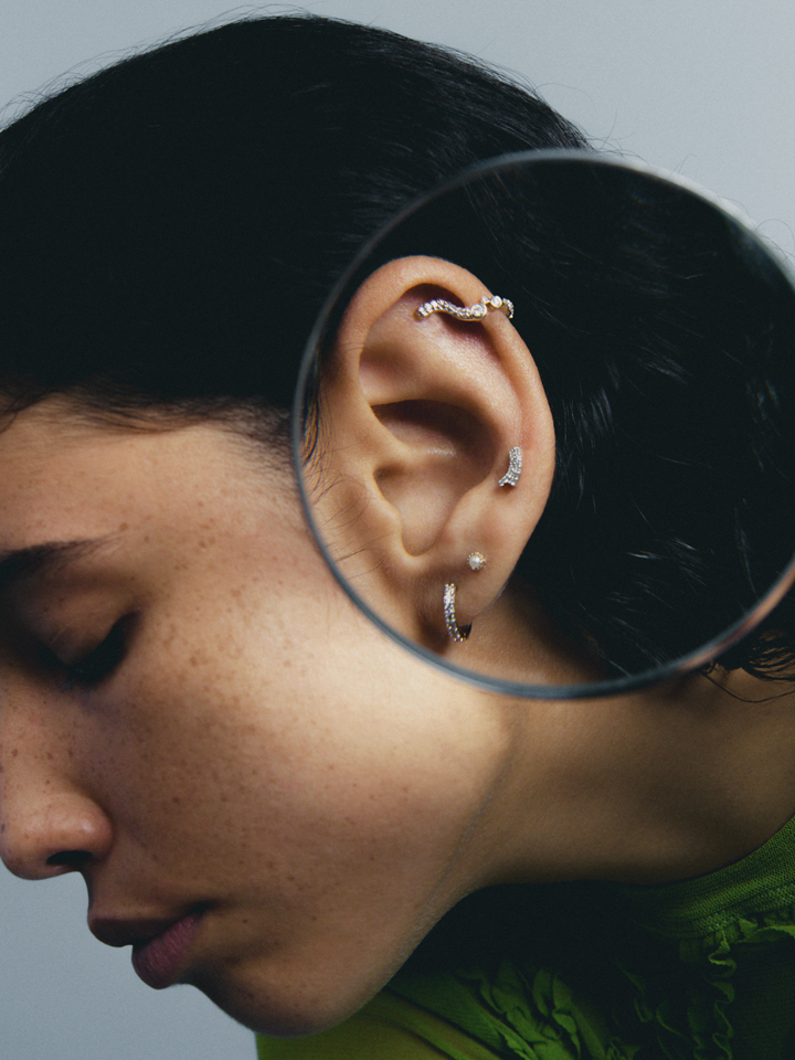 Huggie ørering med lab-grown diamant og farvet keramik detaljer