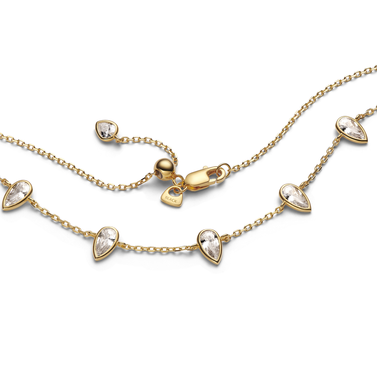 Pear-shaped white zirconia stones are evenly spaced with the point facing down