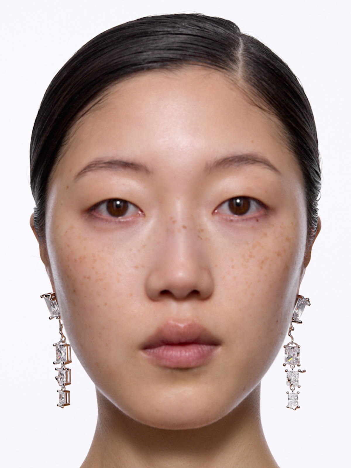 Statement-øredobb med fire store åttekantede, trinnskårne hvite zirkonia i en fordreid kloinnfatning