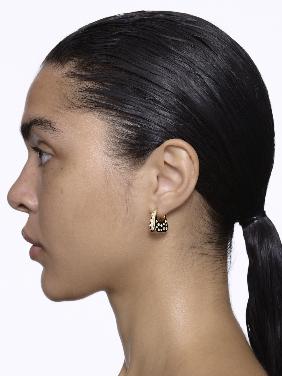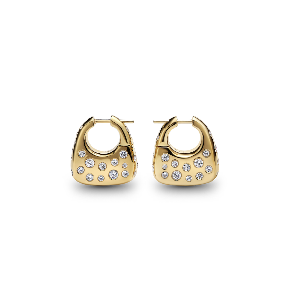 Trekantet ørepynt med flate sider og 36 hvite zirkonia steiner innfelt for hånd.