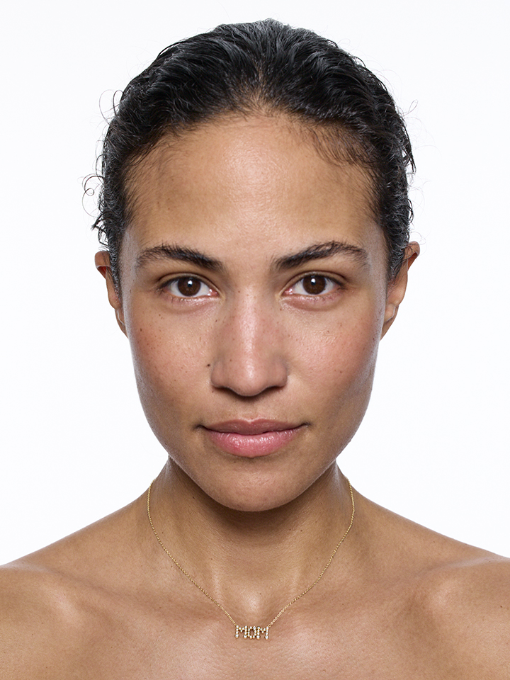 Suspended from a fine chain, the pendant rests lightly at the neckline.