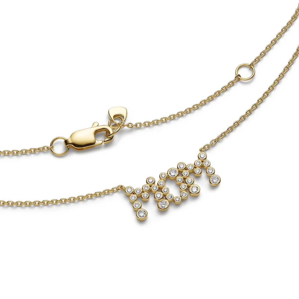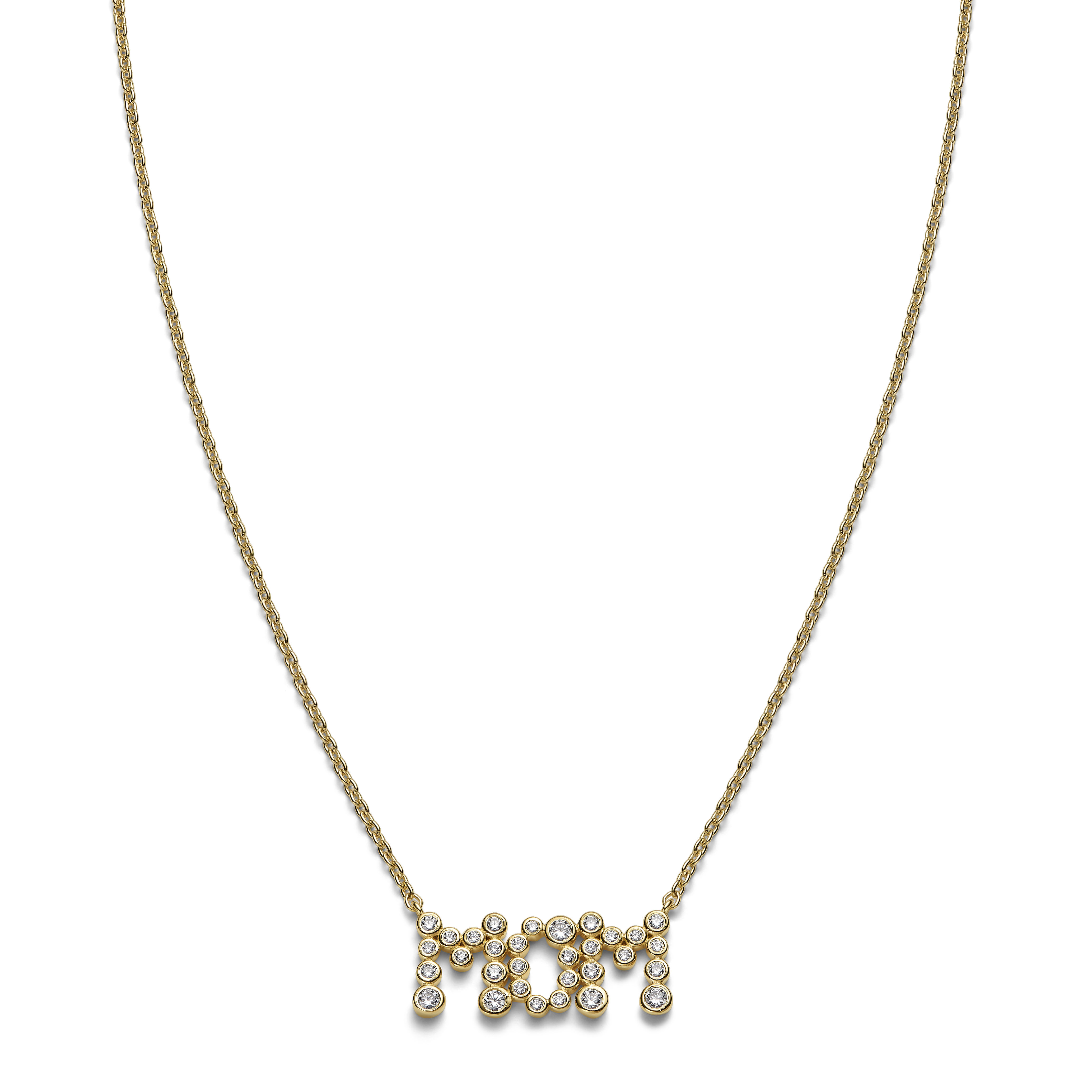 The letters are formed from 31 bezel-set brilliant-cut cubic zirconia stones in graduating sizes, creating a subtle rhythm of light.