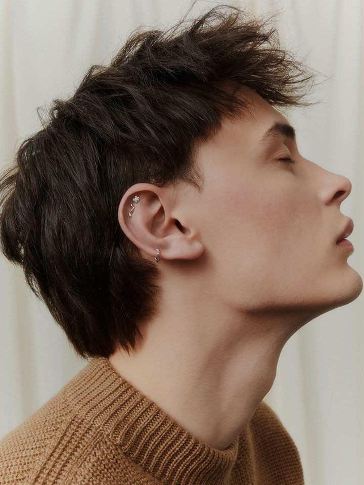 The threaded earring screws into a threaded post, which is inserted from behind the ear. The threaded post has a hygienic and comfortable flat disc