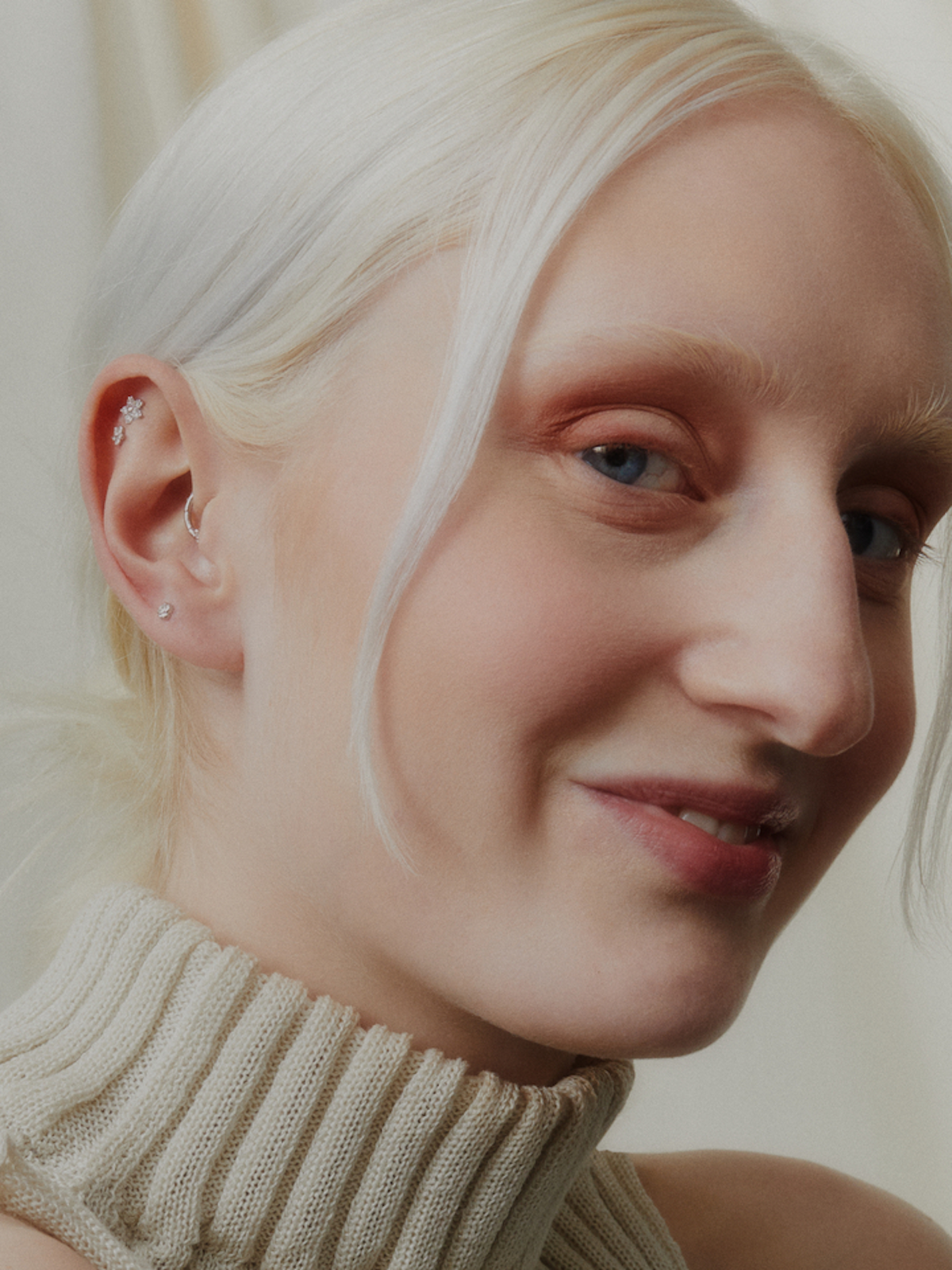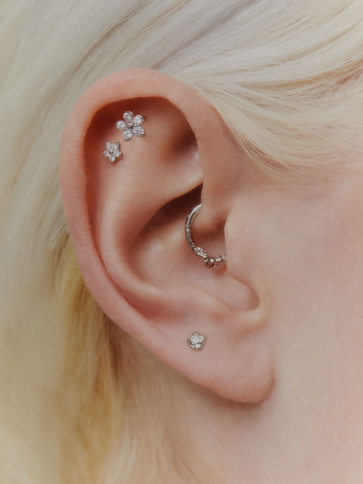The threaded earring screws into a threaded post, which is inserted from behind the ear. The threaded post has a hygienic and comfortable flat disc