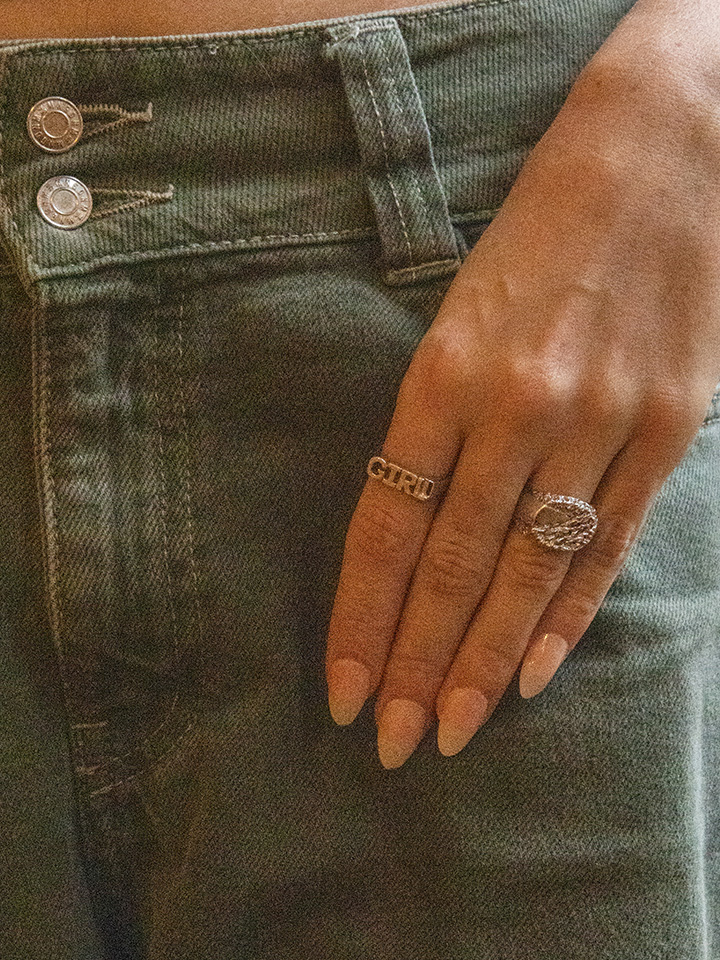 This unisex nameplate ring in silver with the words GIRL could be your next stacking ring. With its old school vibes a new classic has been born.
