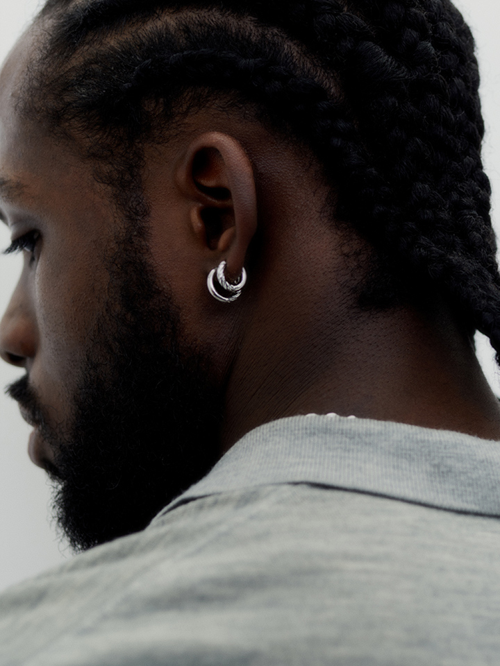 Hyde is a cute little versatile huggie. Clean on one side and with diamond cut wire on the other. Can be used front to back. Also available in a larger size.