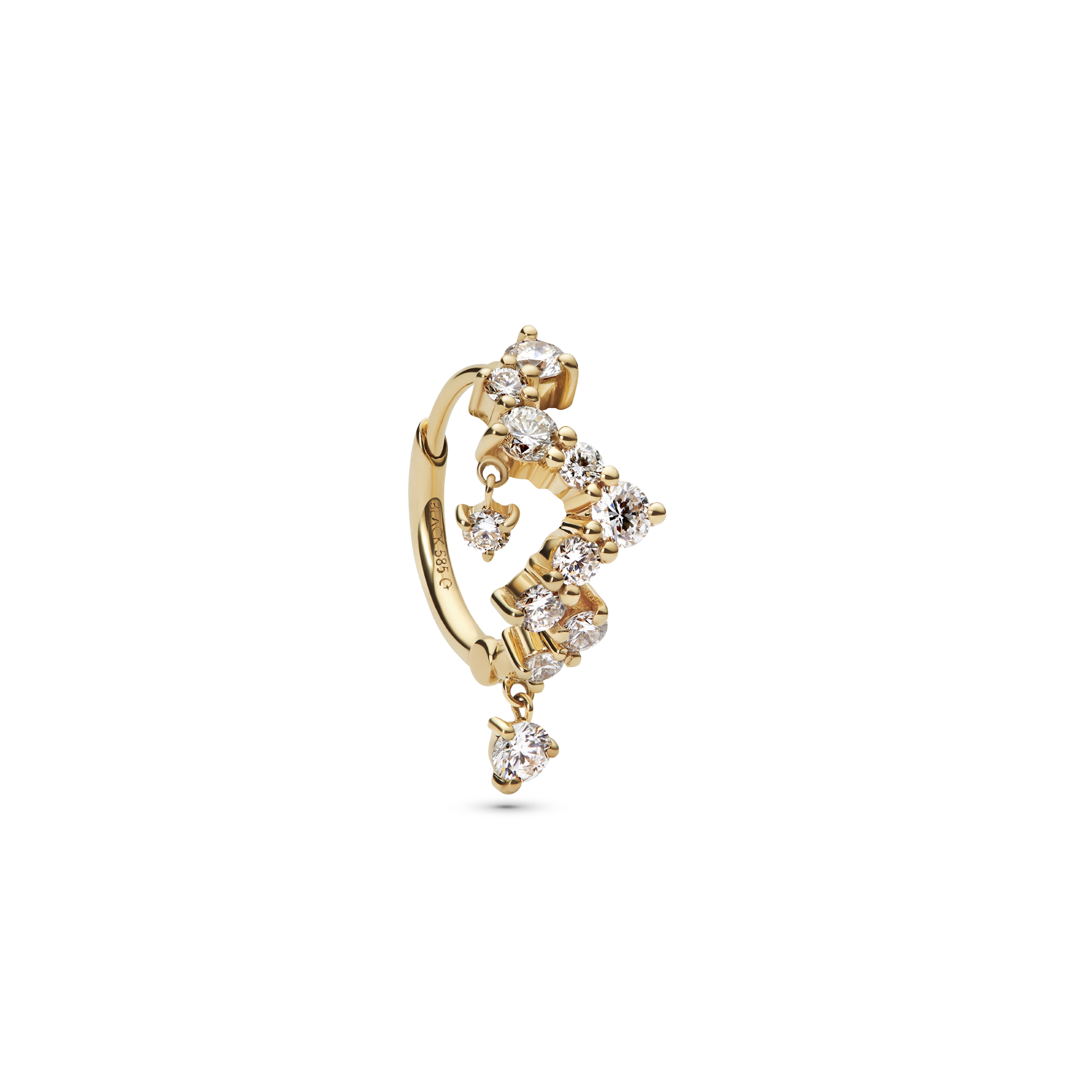 Lab-grown diamond dangles from mid-curve and from the bottom of the huggie, creating movement so all the stones appear to float and dance