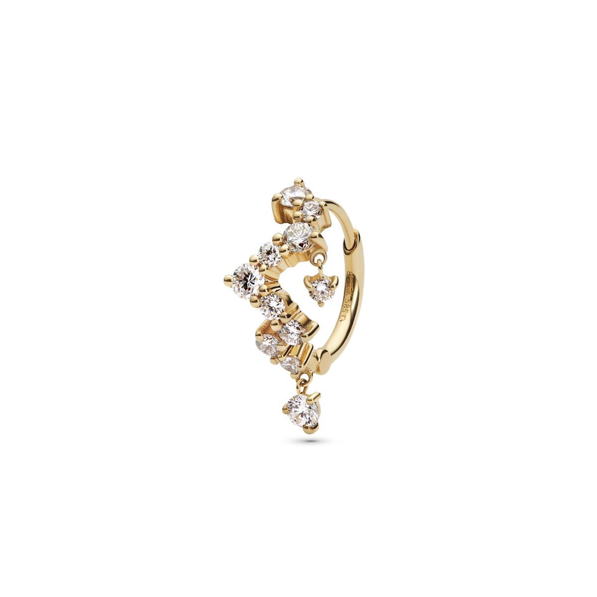 Lab-grown diamond dangles from mid-curve and from the bottom of the huggie, creating movement so all the stones appear to float and dance