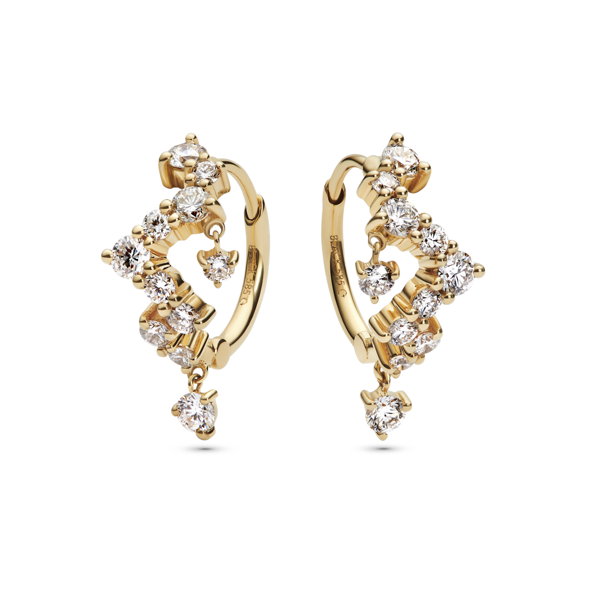Lab-grown diamond dangles from mid-curve and from the bottom of the huggie, creating movement so all the stones appear to float and dance