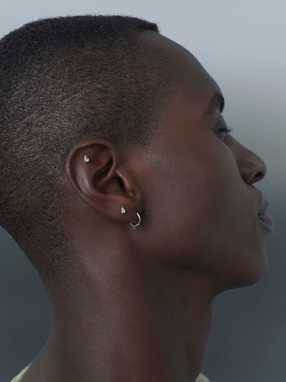 The threaded earring screws into a threaded post, which is inserted from behind the ear. The threaded post has a hygienic and comfortable flat disc