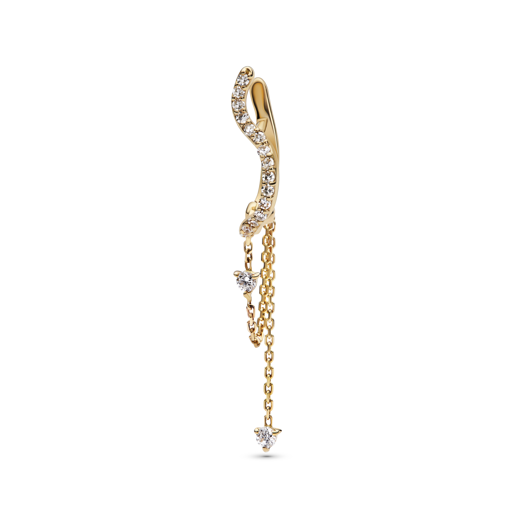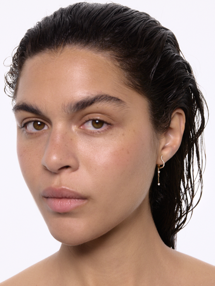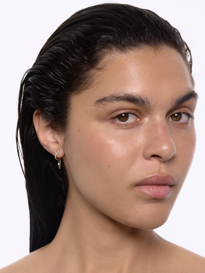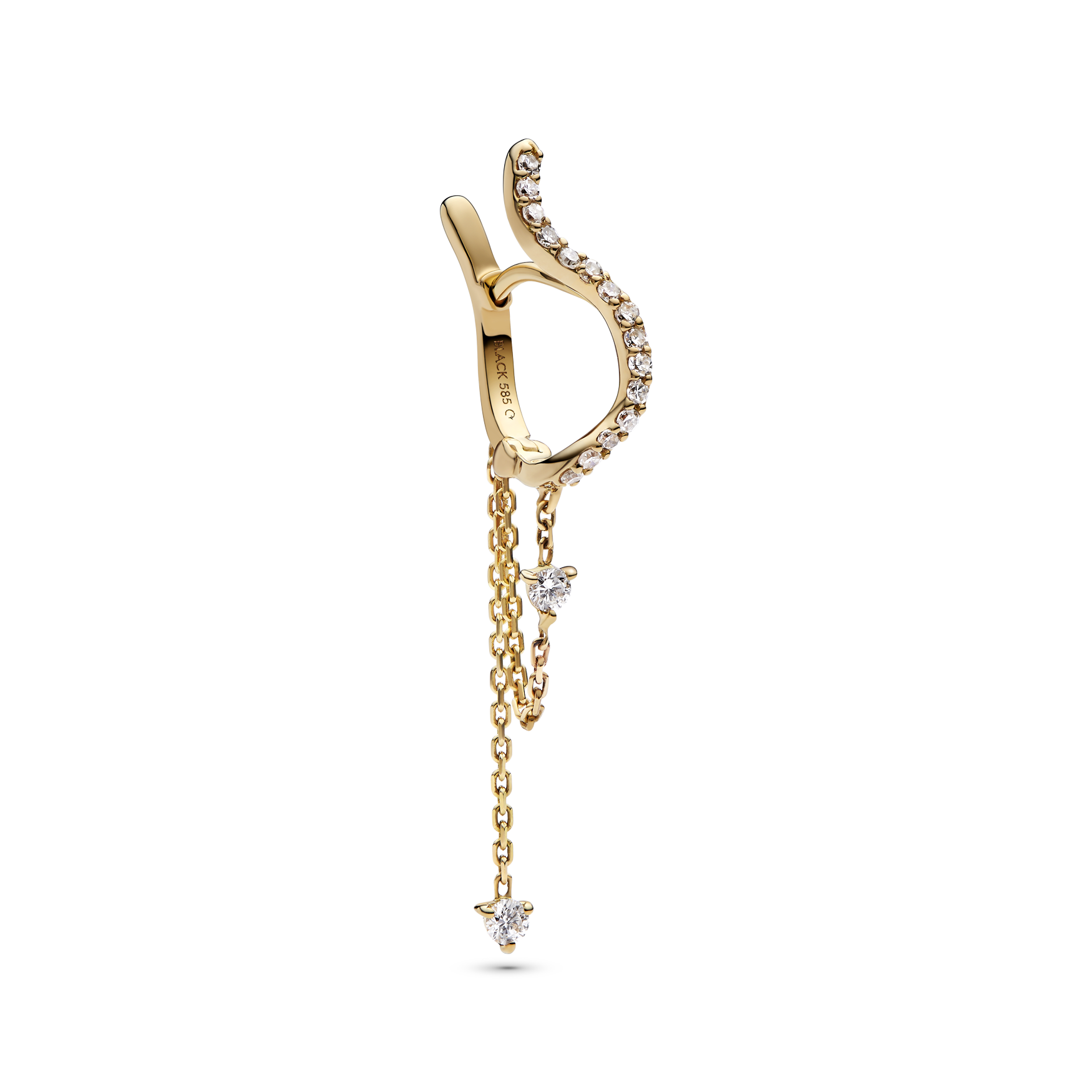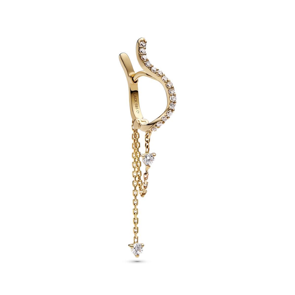 A curved pavé lab-grown diamond set huggie with a looped chain and a dangling chain